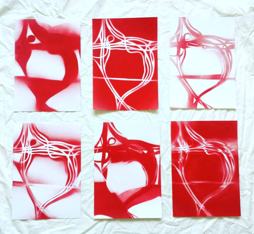 Tuto sprejovací sérii jsem dělal před několika lety. Jezdil jsem po google maps tak dlouho, dokud jsem nenašel dálniční křižovatku v Columbusu, která byla komplikovaná tak akorát. Vyřezal jsem si šablonu a všechny drobné kousíčky schraňoval, abych mohl použít pozitiv i negativ. Při sprejování se pak volné kousky papíru rozlétly nebo naopak přilepily k papíru pod nánosem barvy, kvůli čemuž nešlo moc předpovídat výsledek, což na tom vlastně bylo to zábavné. Taky jsem to už nevím proč sprejoval v pokoji na koleji, takže všude po koberci byly drobné kapičky barvy a ve vzduchu zas acetonové výpary.to